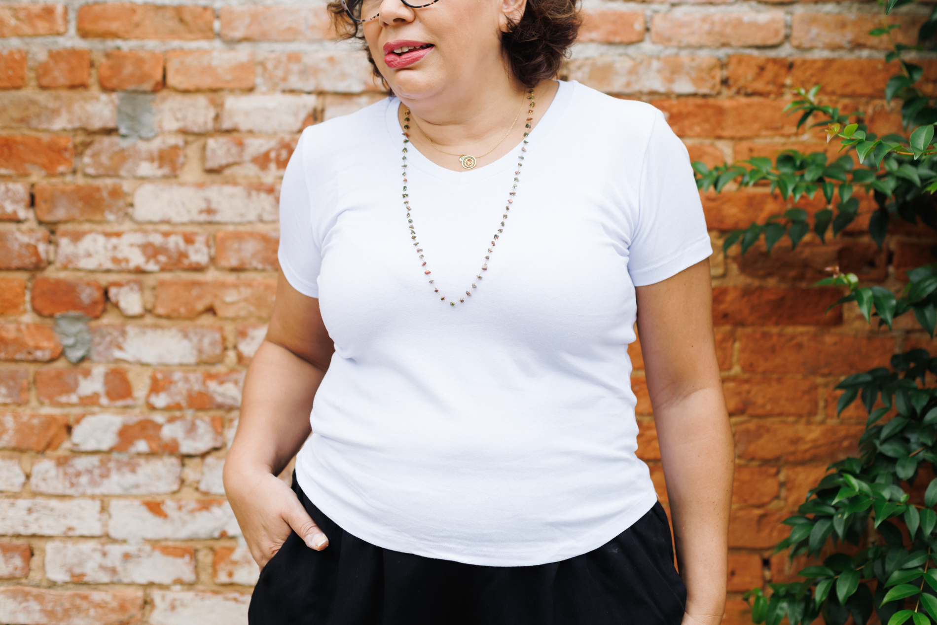 Nossa T-shirt tem a barra levemente arredondada e é mais curta que as camisetas normais, sem ser um cropped. Dessa forma é possível usá-la com as mais variadas peças, sem fazer um grande volume na região da barriga.